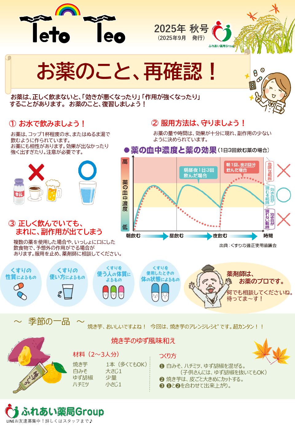 季節ごとの健康に役立つ情報や、ちょっとお得な商品情報をお届けする『Teto Teo(てとてを)』は、ふれあい薬局Groupが発行している季刊誌です。花粉の季節には対策法、夏には紫外線や熱中症予防、冬には冷えや乾燥ケアなど、日々の暮らしに役立つヒントがたくさん詰まっています。また、薬局で人気の商品やキャンペーン情報もご紹介。調剤の待ち時間やおうち時間に、気軽に読める身近な健康情報誌として、ぜひお楽しみください。